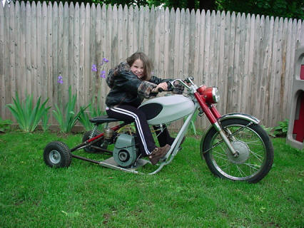 by John Misita, 2011 Below are pictures of what was left of my 1966 Bridgestone 90 sport, after the oil injection system FAILED! Cruising at 50 MPH the engine suddenly locked solid and I came to a screeching halt. Walking 2.5 miles home pushing this dead horse, my thought was to fix it, but as life would have it the young lady in the photo was born and the bike sat forgotten. This was in 2004, my daughter wanted one of those battery powered Barbie jeeps. What we created was a combination Bridgestone/go-cart/1940's model N Briggs and Stratton engine with forward-reverse gearbox. This is in fond memory of the best little street bike I ever owned, living on as a sick twisted toy straight out of Sid's back yard in Toy Story. |